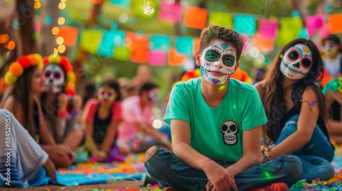 Young man wears sugar skull makeup, smiles with friends at Day of the Dead