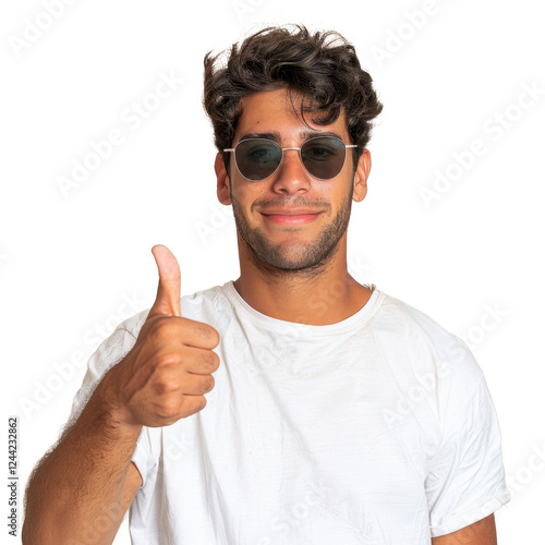 man, young, curly hair, sunglasses, thumb up, positive, confidence, casual attire, smiling, happy, portrait, gesture, approval, style, fashion, cheerful, relaxed, friendly, male, youth, expression, body language, cool, trendy, summer, lifestyle, happiness, joy, fun, casual clothes, modern, informal, self-assured, confident, bright, light, isolated, studio, approachable, social, communication, interaction