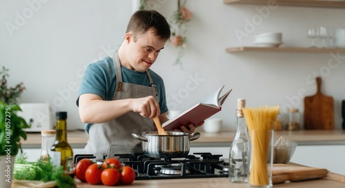 cooking, kitchen, down, inclusive, man, receipe, book, apron, modern, interior, ingredient, diversity, stirring, young, adulthood, lifestyle, home, food, preparation, culinary, decor, stylish, fresh, vegetable, pasta, oil, bottle, countertop, stove, casual attire, relaxed, engagement, enjoyment, passion, concentration, skill, learning, domestic, scene, warmth, inviting, accessible, workspace, healthy, living, creativity, expression, independent, everyday