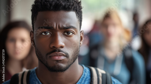 young, man, serious, portrait, crowd, individuality, emotion, sharpened, contemplative, thoughtful, intense, expression, black, male, youth, people, background, urban, street, confident, student, gaze, concentrated, introspective, modern, social, setting, diverse, community, isolated, blurred, interaction, realism, reflective, strength, independence, striking