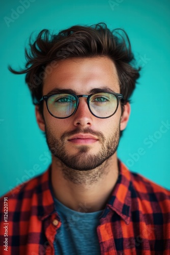 Young man with glasses and stylish hair poses against a vibrant teal background