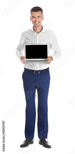 Young man with laptop on white background