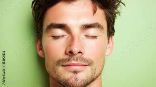 Young man with light stubble and closed eyes relaxing and exhaling calmly against soft green background, expressing peace and tranquility in close up portrait
