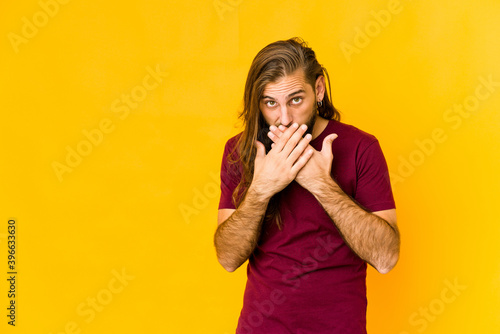 face, portrait, yellow, casual attire, man, person, background, caucasian, isolated, young, male, attractive, long hair, adult, guy, hand, covering, shocked, arm, mouth, gesture, secret, shock, report, talk