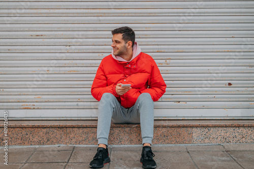 young, phone, street, city, business, closed, blind, sitting, client, smartphone, garage, people, styling, hipster, casual attire, urban, sidewalk, waiting, passenger, travel, youth, latin, standing, employment, diversity, american, neighbourhood, european, attractive, style, cool, sporty, coat, activewear, mobile, mobile phone, app, application, technology, cyberspace, shop, commerce, exploitation, urban life, natural, person, male
