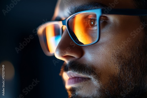 Young man with stylish eyewear gazing thoughtfully into the distance during evening hours