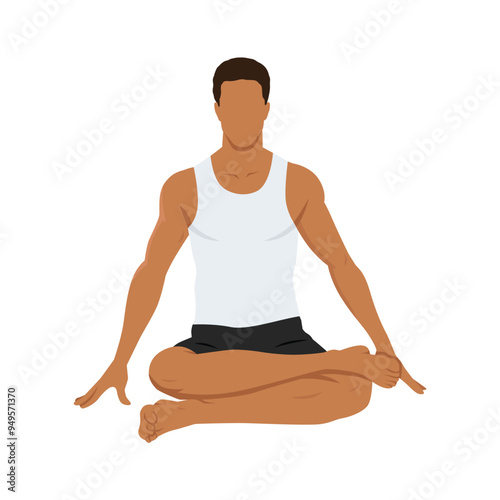 Young manMan doing fire log pose or agnistambhasana yoga exercise. Flat vector illustration isolated on white background