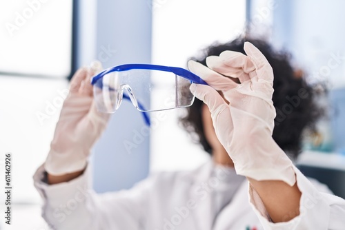 young, middle east, woman, female, adult, person, beautiful, curly, persian, arab, lifestyle, expression, science, research, medicine, scientist, experiment, technology, medicals, professional, microscope, chemist, biology, analysis, work, men at work, working, tube, test, goggles, security, safety, glove, hand, holding, clinic, center, hospital, room, indoor, indoor, laboratory, laboratory, pharmacy, chemistry