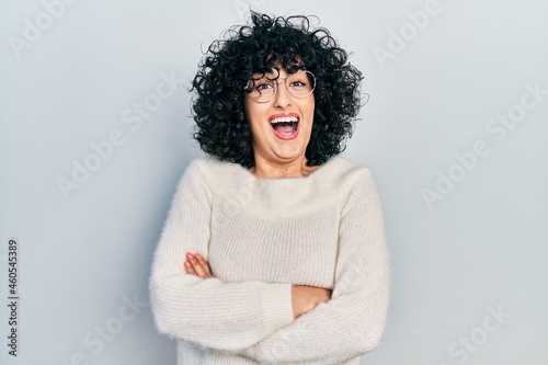 Young middle east woman with arms crossed gesture celebrating crazy and amazed for success with open eyes screaming excited.