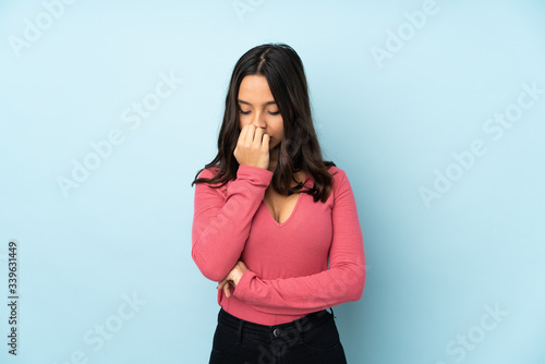 girl, woman, people, person, female, studio, woman, attractive, beauty, cool, pretty, beautiful, casual attire, fashion, slim, young, adult, mixed, race, latin, brunette, background, isolated, colours, colourful, wall, blue, doubt, confused, thinking, expression, uncertain, question, thoughtful, doubtful, concept, thinks, know, puzzled, pensive, uncertainty, future