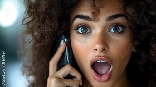 portrait, surprise, shocked, amazed, astonished, curly hair, mixed race, multicultural, phone call, smartphone, mobile phone, communication, emotional, expression, facial expression, reaction, genuine, authentic, lifestyle, young adult, female, woman, blue eye, make-up, beauty, closeup, head shot, candid, contemporary, modern, technology, conversation, excitement, joy, happiness, mobile phone, youth culture