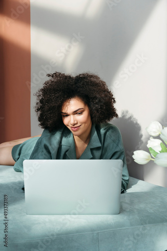 african american, comfort, computer, computer hardware, computer keyboard, conduction, conference call, connect, connection, contemporary, education, electronic, freelancer, furniture, contraption, green, home, home office, indoor, cyberspace, jean, laptop, leisure, linen, lying, modern, online, pajama, portrait, positive, pretty, relaxation, smile, spring, successful, use, wireless, working