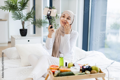 Young Muslim woman in hijab recording video about skincare using natural products in comfortable home environment filled with natural light and decor. Promotes healthy skincare routines and home