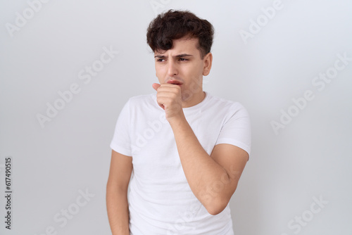 Young non binary man wearing casual white t shirt feeling unwell and coughing as symptom for cold or bronchitis. health care concept.