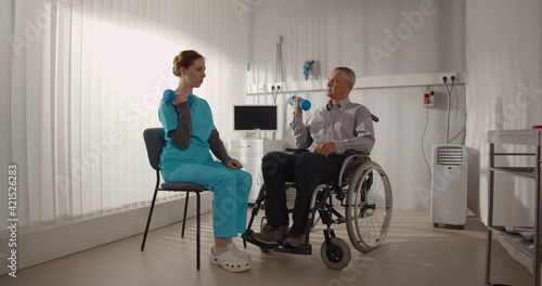 young, nurse, helping, patient, wheelchair, physical, exercise, dumbbell, doctor, assisting, senior, man, rehabilitation, people, adult, assistance, care, caucasian, disability, equipment, exercising, expertise, health care, medicine, healthy, lifestyle, hospital, disease, indoor, medicals, occupation, impairment, injury, therapy, professional, recovery, scrub, sitting, special, sport, support, teamwork, 2, uniform, woman, male, female, physical therapy