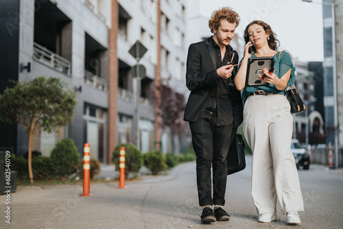 Young partners discussing innovative growth strategy, analyzing market research in urban city. Entrepreneurial spirit driving targeted expansion and increased revenue.