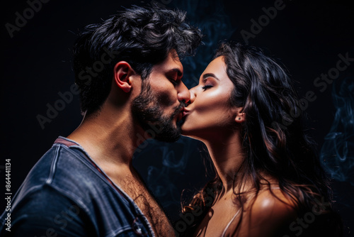 Young people in love. Close-up portrait of young couple in love, hug embrace with romance together, kissing, photographed in studio, dark background.