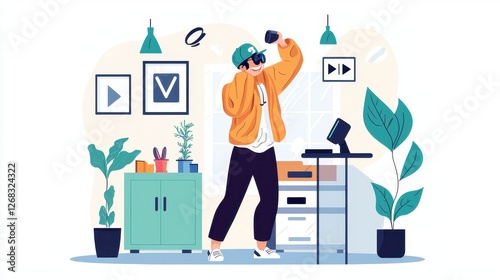 Young person dancing with a camera in a stylish indoor space., social media content creator concept