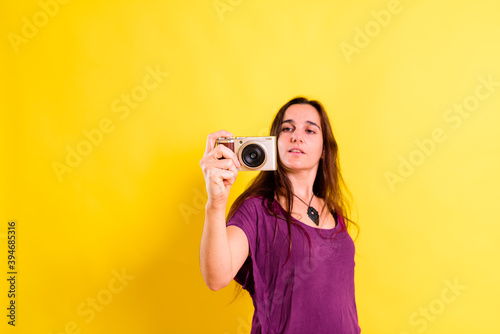 Young photography student girl holds a compact camera, isolated on yellow studio background.