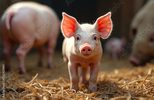 Young piglet stands on straw bedding with adult pigs nearby on farm. Cute pink mammal waits, farm animal lives in natural rural setting. Domestic piglet looks at camera.