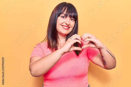 Young plus size woman wearing casual clothes smiling in love showing heart symbol and shape with hands. romantic concept.