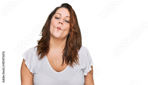 Young plus size woman wearing casual white t shirt making fish face with lips, crazy and comical gesture. funny expression.