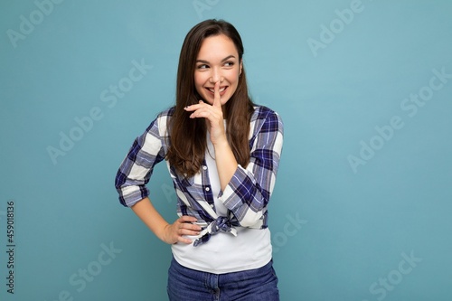 Young positive smiling beautiful brunet woman with sincere emotions wearing trendy check shirt standing isolated on blue background with empty space and showing shh gesture