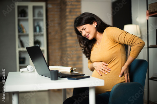 Young pregnant woman having painful contraction. Businesswoman holding her belly..