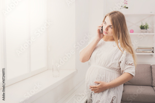 woman, baby, technology, pregnant, mobile phone, maternity, parenthood, smiling, beautiful, belly, caucasian, cheerful, childbirth, concept, expectant, expecting, female, contraption, happy, holding, home, leisure, mobile, mother, motherhood, phone, pregnancy, smartphone, talking, young, health care, consultation, conversation, husband, touch, push, happiness, pleasant, enjoy, free space, copy space, window, standing, white, dress, filtered, toning