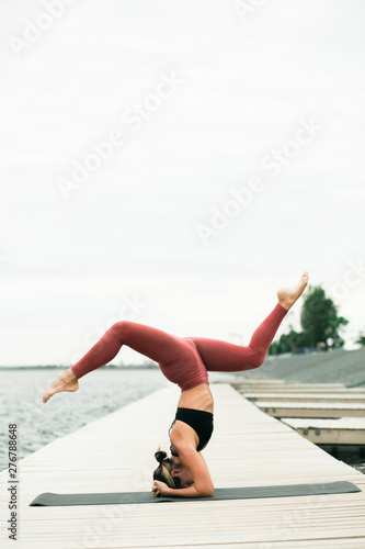Young Pretty asian girl doing yoga outdoors on the pier by the lake.