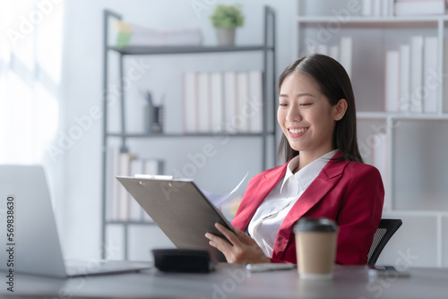 Young pretty attractive asia chinese half thai woman mixed race working with online balance sheet outsource, online bookkeepers helpful consult customized accounting reports and financial statements.