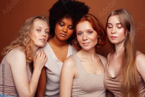 young pretty caucasian, afro, scandinavian woman posing cheerful together on brown background, lifestyle diverse nationality people concept