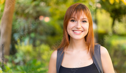 Young pretty redhead woman at outdoors with happy expression