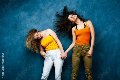 young pretty teenage girls friends with blond and brunette curly hair posing cheerful on blue background, lifestyle people concept