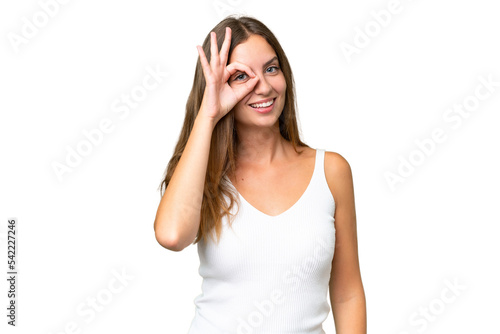 Young pretty woman over isolated background showing ok sign with fingers