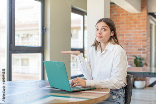 young pretty woman shrugging, feeling confused and uncertain. working with a laptop