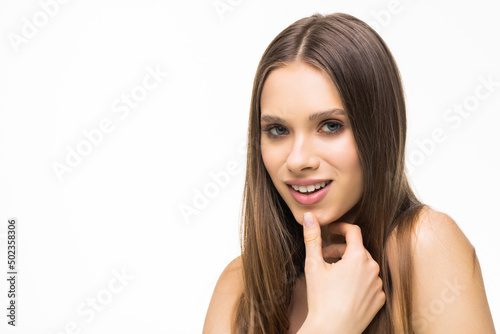 Young pretty woman with professional makeup isolated on white background. Beauty