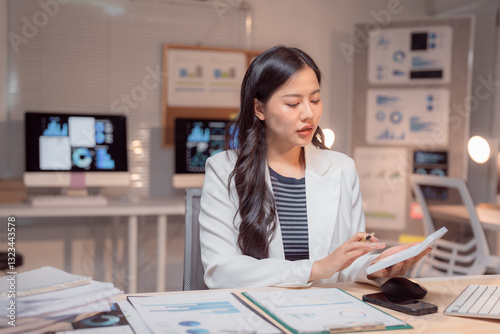 business, woman, office, finance, working, calculating machine, document, analysis, night, asian, businesswoman, computer, chart, graph, paperwork, review, late, modern, dedication, sharpened, professional, young, career, accounting, datum, technology, corporate, job, work, evening, overtime, desk, workplace, analysing, calculating, financial, report, investment, strategy, planning, growth, success, entrepreneur, executive