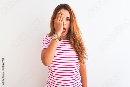 Young redhead woman wearing striped casual t-shirt stading over white isolated background covering one eye with hand, confident smile on face and surprise emotion.