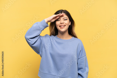Young Russian girl isolated on yellow background saluting with hand with happy expression