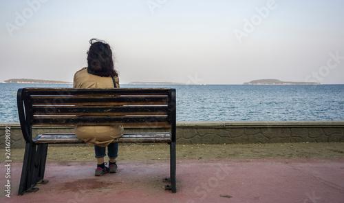 Young sad depressed woman sit alone on bench, looking at distant sea / seascape horizon. Time to go, say goodbye. Miss someone. Desire, hope to go far away. Unhappy girl feel lonely at seaside outdoor