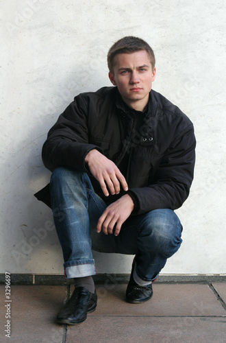 human, person, people, individual, alone, lifestyle, adult, only, fashion, jacket, jean, black, male, man, guy, model, young, stud, caucasian, sexy, photogenic, gorgeous, attractive, serious, looking, thinking, staring, expression, emotion, thoughtful, out, door, day, daytime, walk, rest, marble, background, white, to sit, sitting, portrait, face