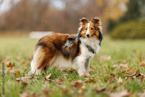 dog, shetland sheepdog, collie, pet, animal, canino, portrait, park, autumn, grass, fur, fluffy, young, puppy, breed, harness, outdoors, nature, leaf, season, cute, adorable, mammal, domestic, training, walk, owner, loyal, alert, attentive, standing, sideview, tail, ear, expression, face, background, copy space, daylight, playful, companion, friendship, parkland, lifestyle