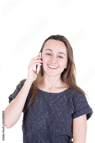 woman, girl, phone, mobile, technology, communication, smart, talking, beautiful, attractive, female, young, adult, 1, people, person, caucasian, white, background, casual attire, attire, isolated, pretty, happy, portrait, beauty, smile, lifestyle, cute, 1, face