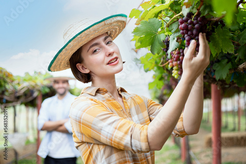 Young smiling woman with husband harvesting ripe grape in farm. People working in vineyard during harvest season