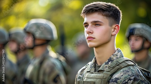 Young soldier in military uniform. A young soldier in camouflage uniform stands with a serious expression, representing military service, duty, and patriotism.