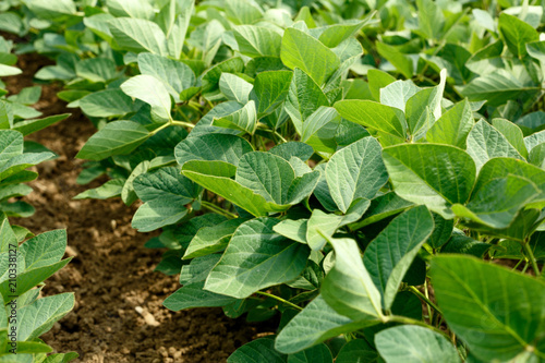 young soybean field rows in summer.