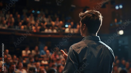 young specialist asking a question during a Q&A session at an international tech conference with a crowded dark auditorium and a speaker addressing a global business summit