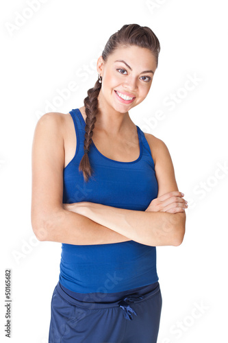 fitness, woman, young, activity, adult, athlete, background, beautiful, blue, body, build, carefree, caucasian, cheerful, clothing, cute, dancing, energy, exercise, fashion, female, fun, girl, hair, happiness, health, human, instructor, isolated, joy, length, life, looking, muscular, only, people, person, physical, portrait, relaxation, skin, slim, smile, sport, standing, t-shirt, training, vitality, well-being, white