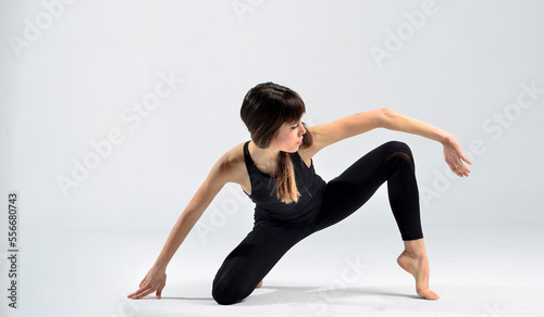 Young sporty yogi woman practicing yoga, doing Wild Thing, pose, working out, wearing sportswear, black pants and top, indoor full length, white yoga studio